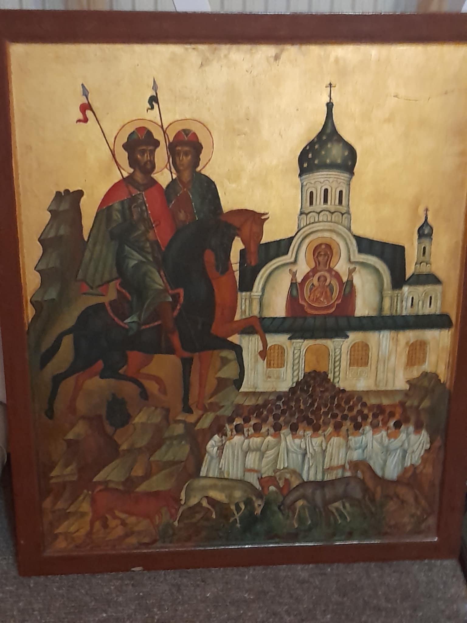Diese heilige Ikone, die Allerheiligste Gottesmutter Pokrowa sowie die heiligen Fürsten und Märtyrer Boris und Gleb zeigt, wird in der Kosakenkapelle von Lienz angebracht zum Gedenken an